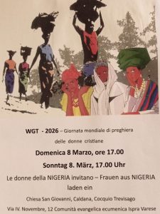 La Comunità Evangelica Ecumenica di Ispra-Varese vi invita cordialmente alla Giornata Mondiale di Preghiera 2026! Domenica 8 marzo, alle ore 17, celebreremo una preghiera nella Chiesa di San Giovanni a Caldana (Frazione di Cocquio Trevisago). La liturgia del culto è stata preparata da un team di donne della parrocchia cattolica di Sacra Famiglia (Cocquio) e della Comunità Evangelica Ecumenica di Ispra-Varese, sotto la guida della pastora Magdalena Tiebel-Gerdes. La Giornata Mondiale di Preghiera, la prima celebrata nel 1927, è un movimento di donne cristiane di diverse confessioni. È un esempio di pace e riconciliazione.